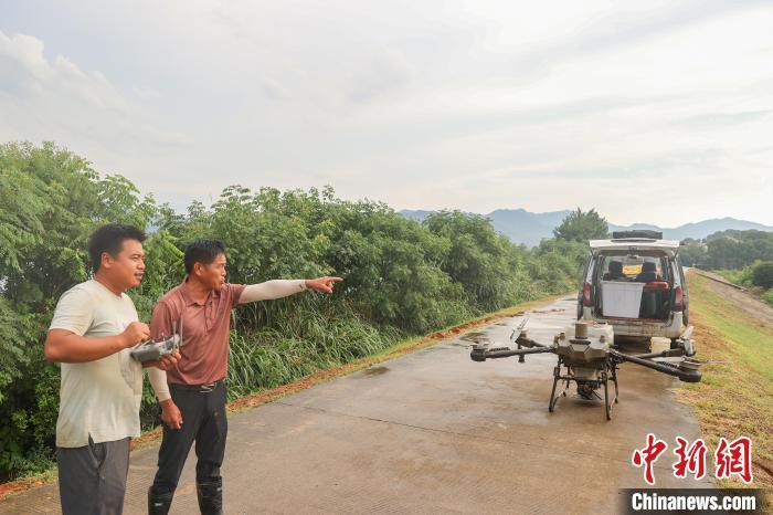 7月11日,江西永修县白槎镇郭坂村,农用无人机操作员熊文明(图左)和种粮大户徐昌怀(图右)沟通无人机补种作业的区域。徐昌怀承包的1900多亩稻田在本轮洪灾中受灾 ,随着洪水逐渐退去,徐昌怀抢抓近日的晴好天气,开展复耕补种工作。永修县地处江西五大河流之一的修河下游,境内水系发达,也是江西省6月中下旬开始的洪涝和地质灾害的主灾区之一,洪涝灾害导致该县部分农作物受灾严重。中新社记者 刘力鑫 摄