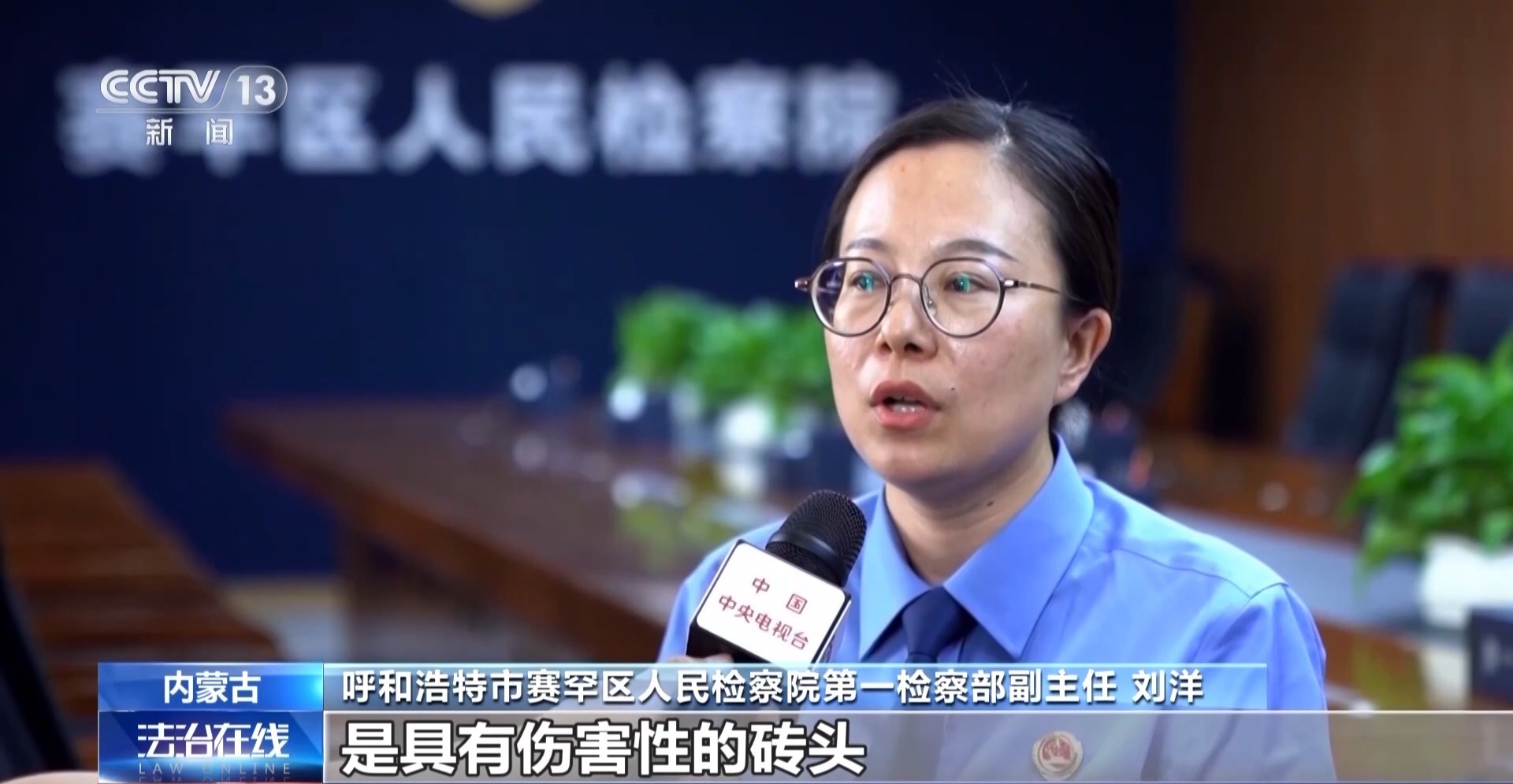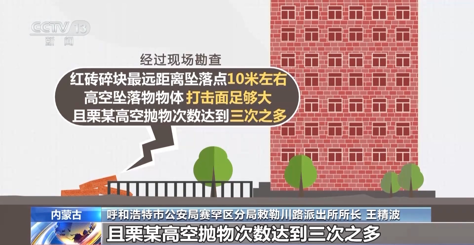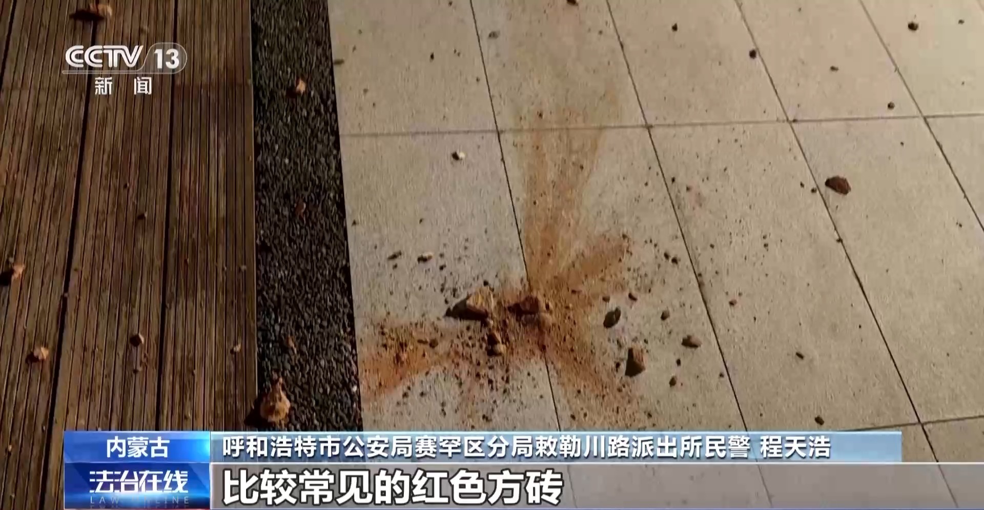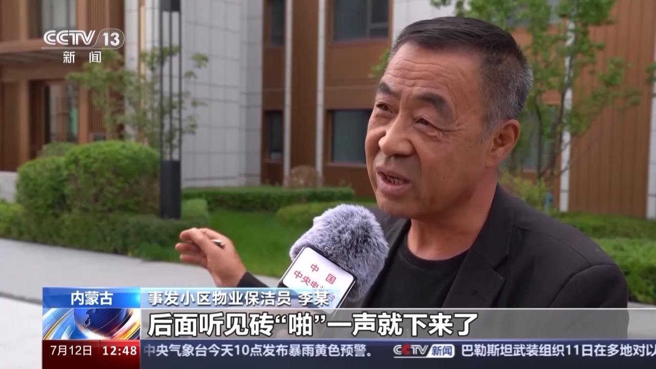 呼和浩特市公安局赛罕区公安分局敕勒川路派出所民警 程天浩:通过判断,现场的砖应该是日常生活中比较常见的红色方砖。如果砸到人,很有可能威胁人的生命。而且砖砸下来的破坏面也非常广,基本上就是2号楼的北面一直延伸到1号楼的南面整个范围都是这三块砖的打击面积。