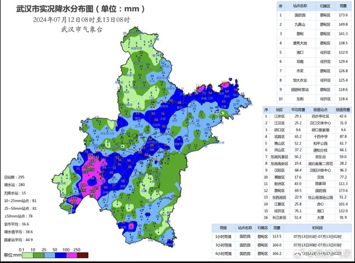 武汉气象监测显示:昨天夜间降水自南向北发展,经开、蔡甸、江夏南部、中心城区汉阳片区、武昌片区、长江新区和新洲北部暴雨到大暴雨,雨量50-170毫米,东西湖、黄陂东部、新洲南部和江夏中部中到大雨,雨量20-50毫米,其他地区20毫米以下。过程期间伴有明显的短时强降水、雷暴大风等强对流天气。过去24小时(12日08时至13日08时)最大累计雨量和最大小时雨强均出现在蔡甸区国防园站,分别为173.6毫米和113.5毫米(13日02时),小时雨强具有一定极端性。全市大部有5到6级雷暴大风,蔡甸、经开、长江新区北部和黄陂东部达8-9级,最大阵风为蔡甸区蔡甸站23.1m/s(9级,13日02时30分)。