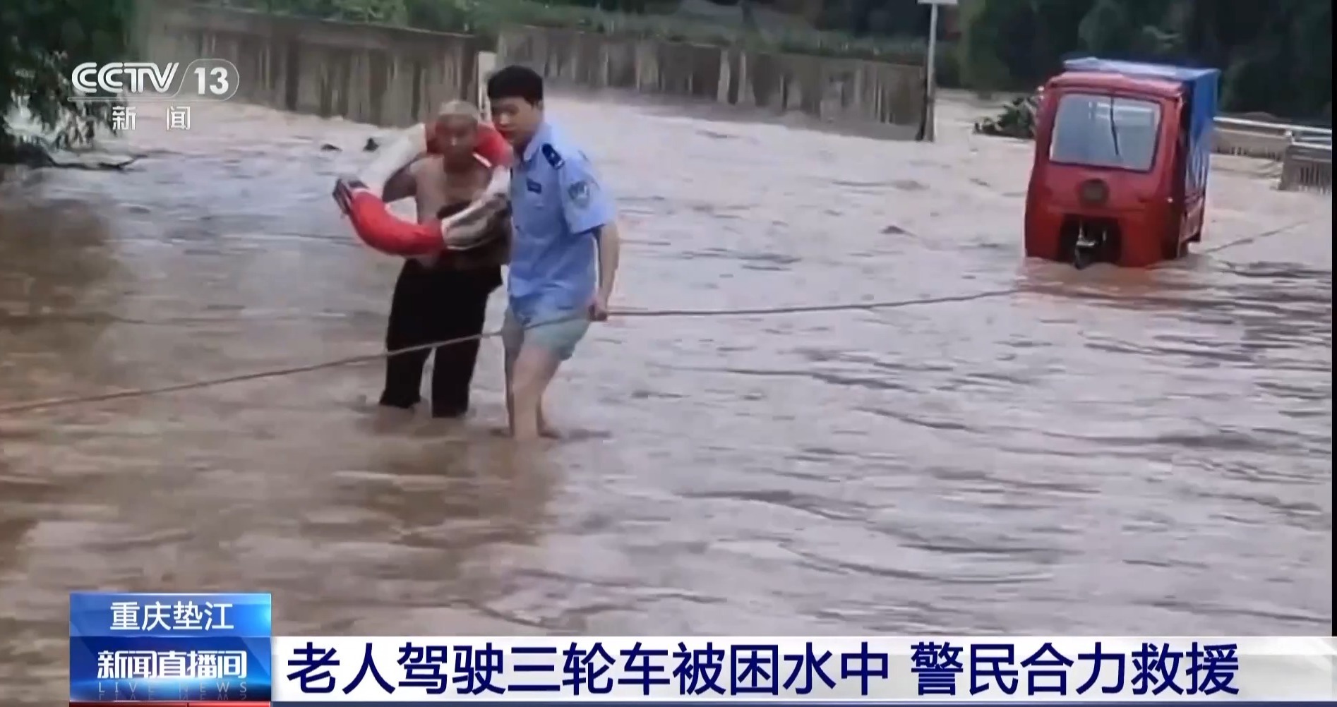 老人驾驶三轮车被困水中 警民合力救援