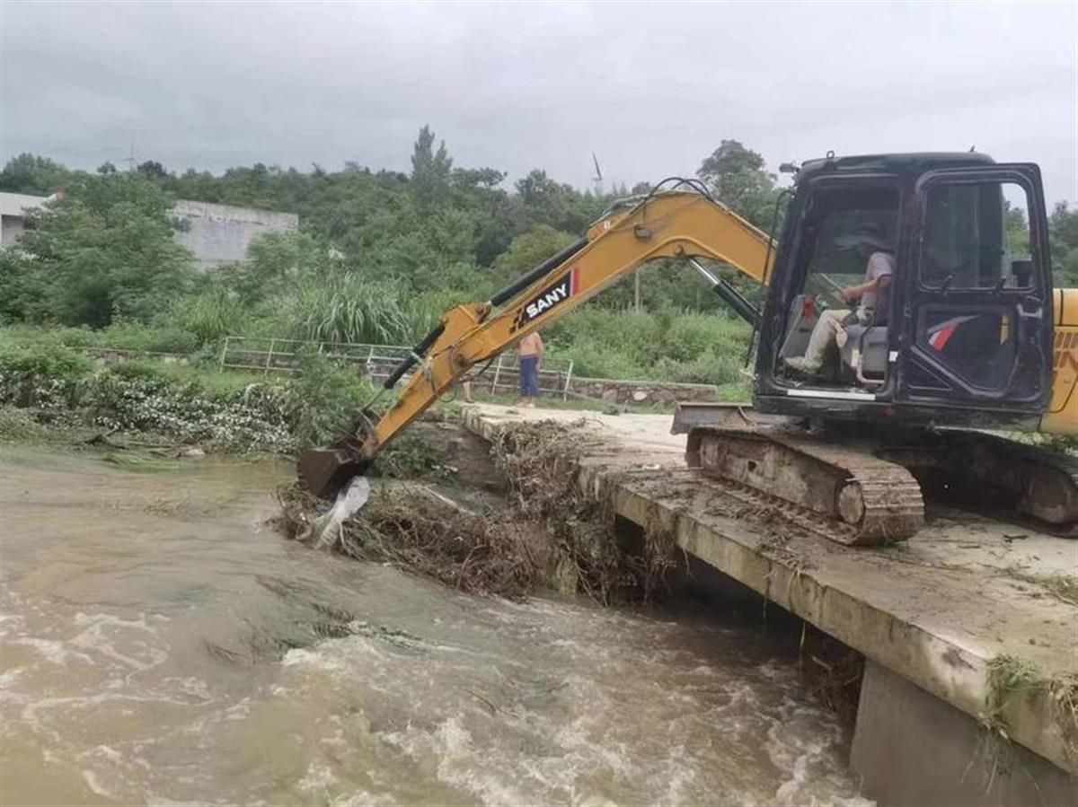 大悟县城关镇罗城村组织4台工程车辆,对影响河流泄洪的树枝、藤蔓等进行清理,确保河道安全度汛。