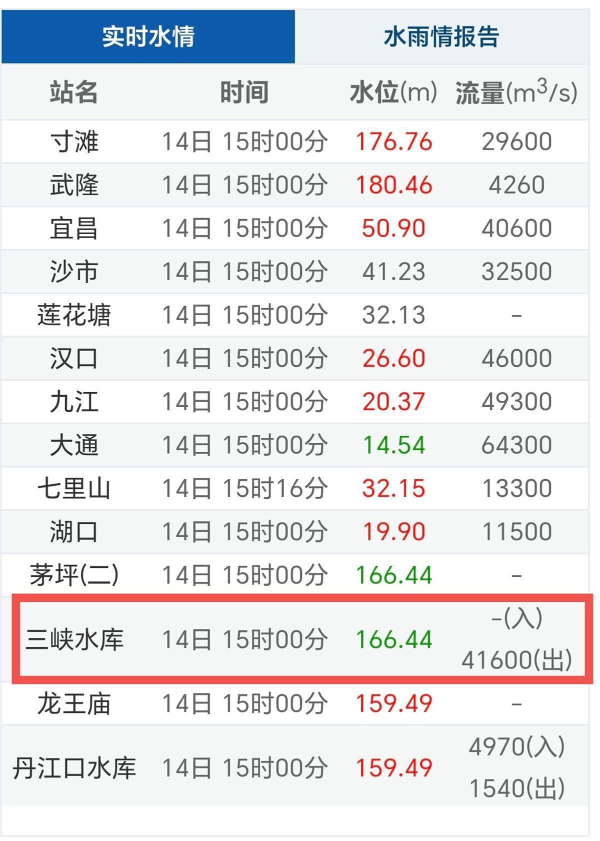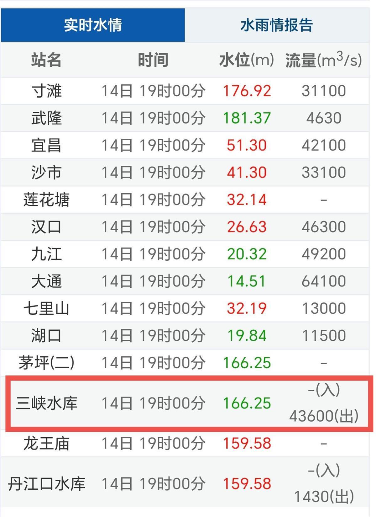 7月14日,极目新闻记者查询长江水文网发现,当日19时,三峡水库水位166.25米,出库流量为43600立方米每秒,已开启九孔泄洪。据悉,预计15日三峡水库将再迎来一次洪水过程。