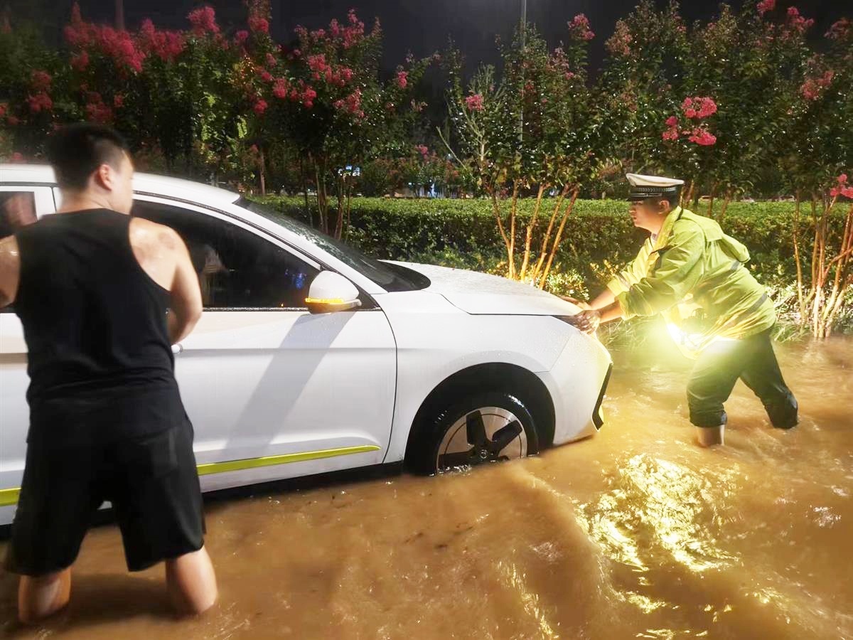 当天凌晨1时许,武昌区公安分局交通大队发现公正路涵洞严重积水,该大队机动队民警苏智越、辅警金亮接到任务,前往该路段封闭涵洞两侧道路。两人来到现场,发现一辆白色小车在涵洞里的积水中熄火,积水已经淹没了半个车门,驾驶员还被困在车内。民警立即上前救援,蹚入漫过了大腿根的积水,救出了被困的驾驶员。