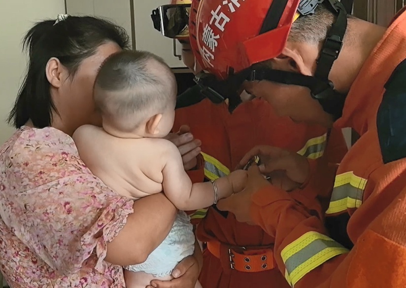 消防员不停安抚着婴儿情绪