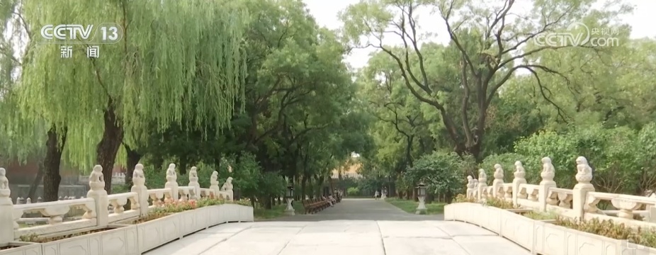 沿着断虹桥一路往北就进入了名副其实的林荫路。道路两侧高大的树木枝繁叶茂、遮云蔽日,这里的很多绿植都是“活文物”。鼎鼎大名当属十八槐,这18棵古槐始种于明代,树龄最大的一颗已有600多岁。