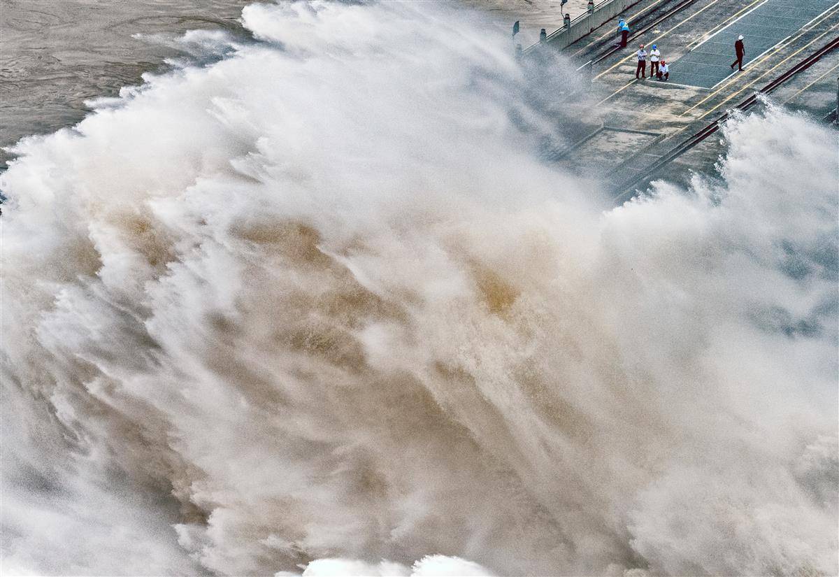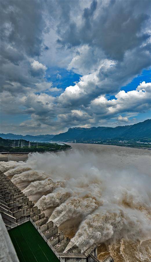 7月16日16时,记者在三峡大坝坝顶看到,9股巨大的“水龙”喷薄而出,三峡大坝依然维持9孔泄洪。16日16时,三峡出库流量43900立方米每秒,三峡水库水位164.91米。