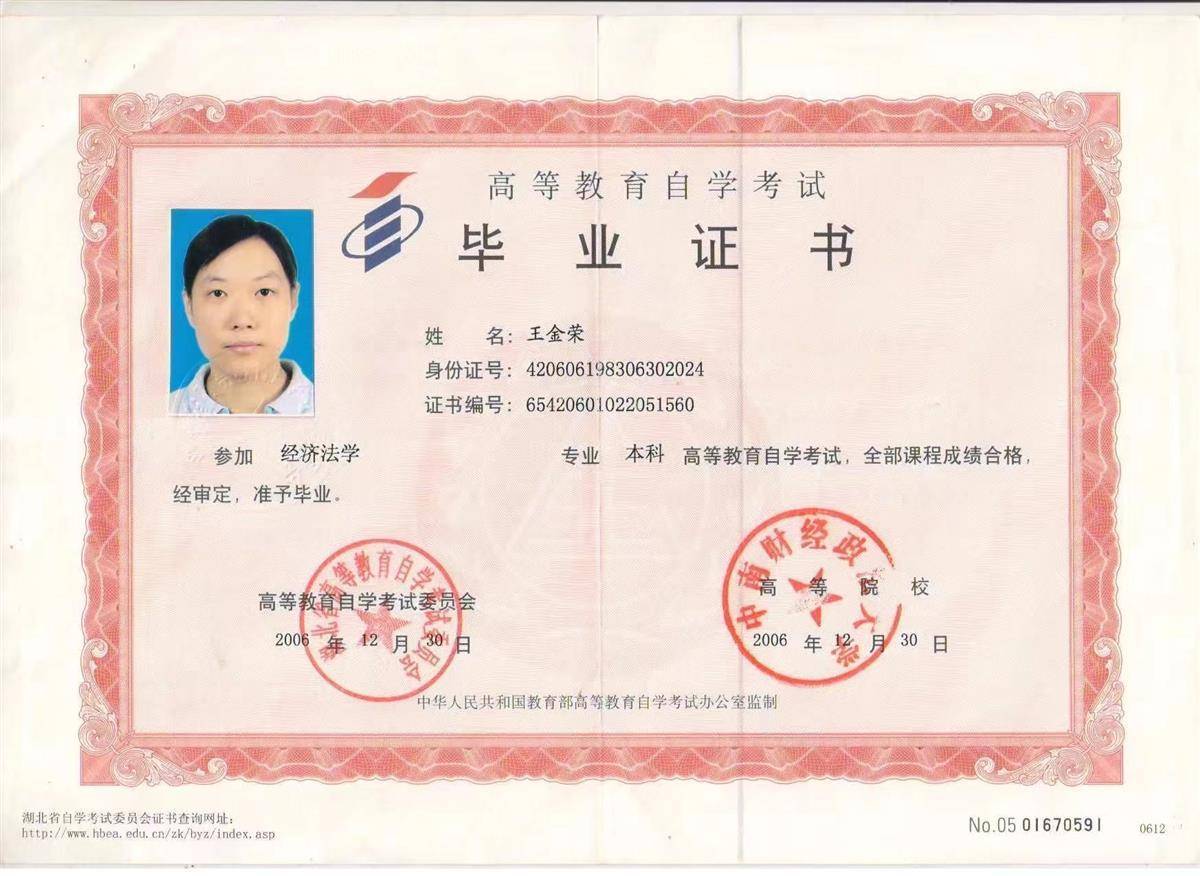在父亲的影响下,女儿王金荣在襄樊学院(现更名为湖北文理学院)读大学期间,就利用课余时间自学。“父亲是我自学旅程的启蒙者和最坚定的支持者。”2006年,王金荣大学毕业时,已通过自学考试取得中南财经政法大学经济法学自考本科毕业证书、法学学士证书。