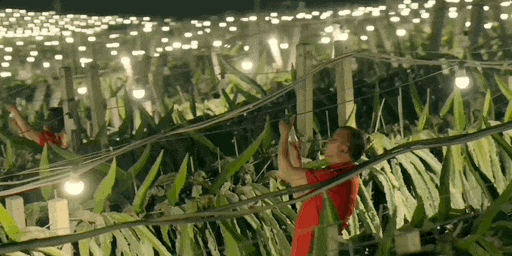 基地对火龙果进行夜间补光,为的是让火龙果开出更多的花,从而提高产量。