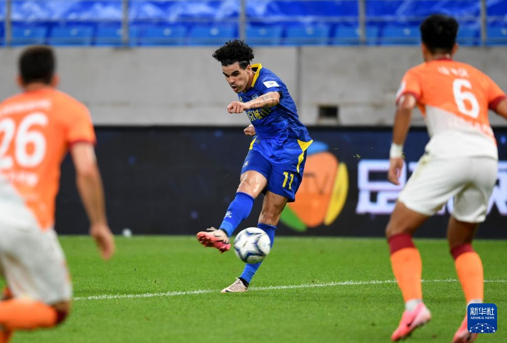 7月17日,南京城市队球员马特乌斯(中)在比赛中射门。新华社记者 李紫恒 摄