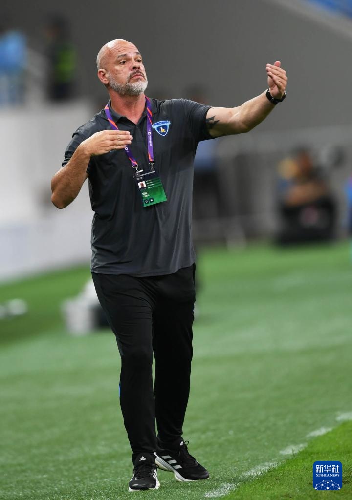 7月17日,南京城市队主教练法比奥在比赛中指导球员。新华社记者 李紫恒 摄