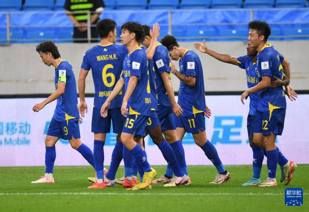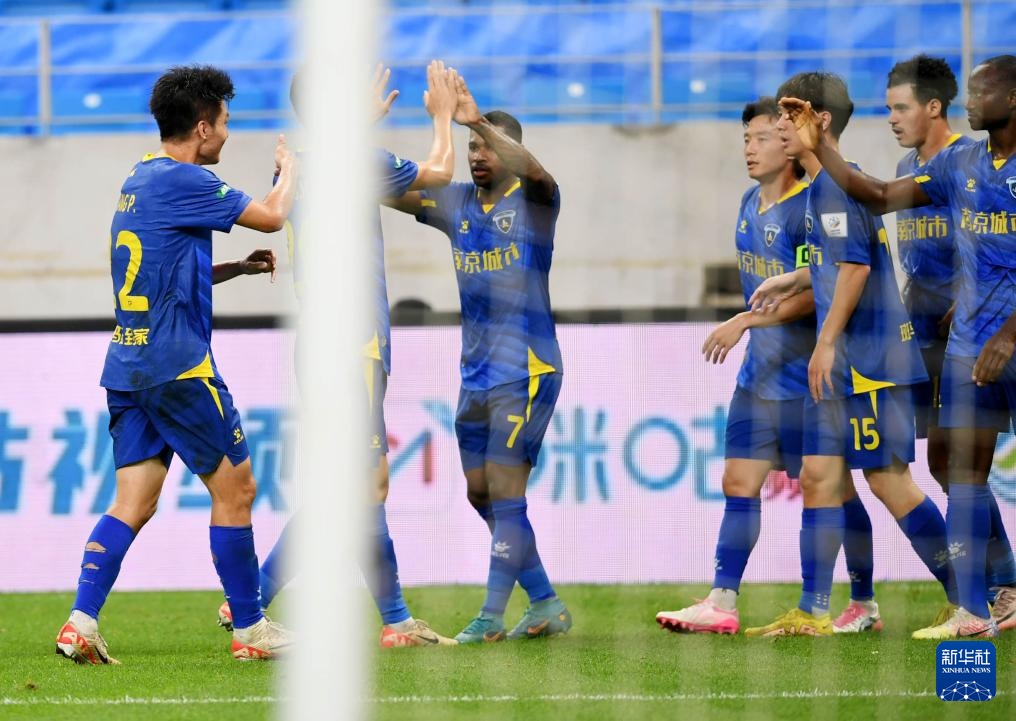 7月17日,南京城市队球员在比赛中庆祝进球。新华社记者 李紫恒 摄