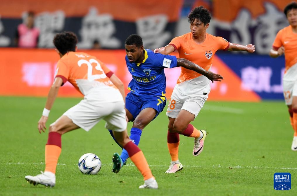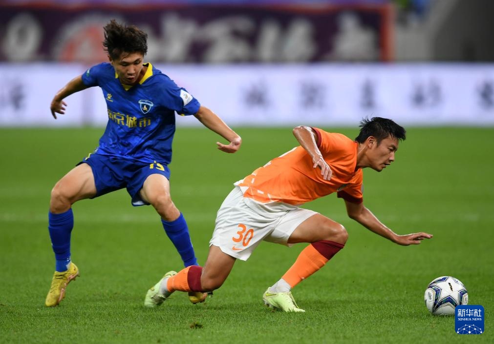 7月17日,南京城市队球员杰弗森(左二)在比赛中带球突破。新华社记者 李紫恒 摄