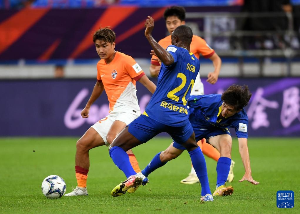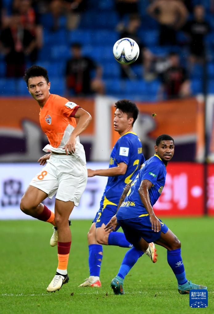 7月17日,青岛海牛队球员张威(左一)在比赛中与南京城市队球员拼抢。新华社记者 李紫恒 摄
