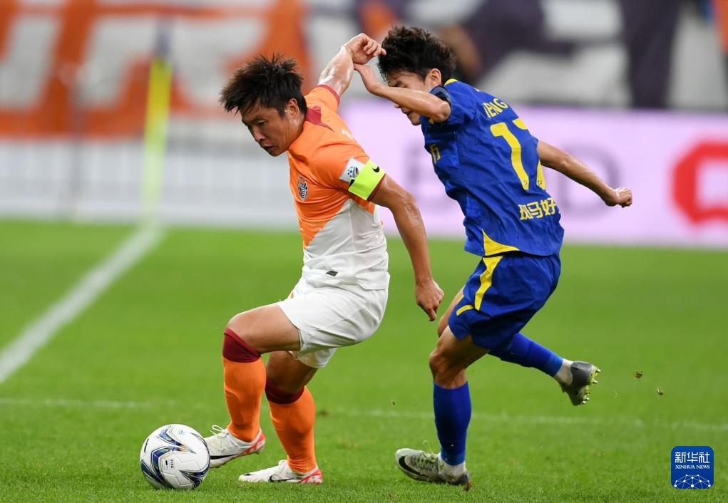 7月17日,青岛海牛队球员郑龙(左)与南京城市队球员孟振拼抢。新华社记者 李紫恒 摄