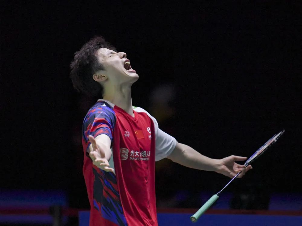 6月9日,石宇奇庆祝夺冠。当日,在雅加达举行的2024年印度尼西亚羽毛球公开赛男单决赛中,中国选手石宇奇2比1战胜丹麦选手安东森,夺得冠军。新华社记者 徐钦 摄