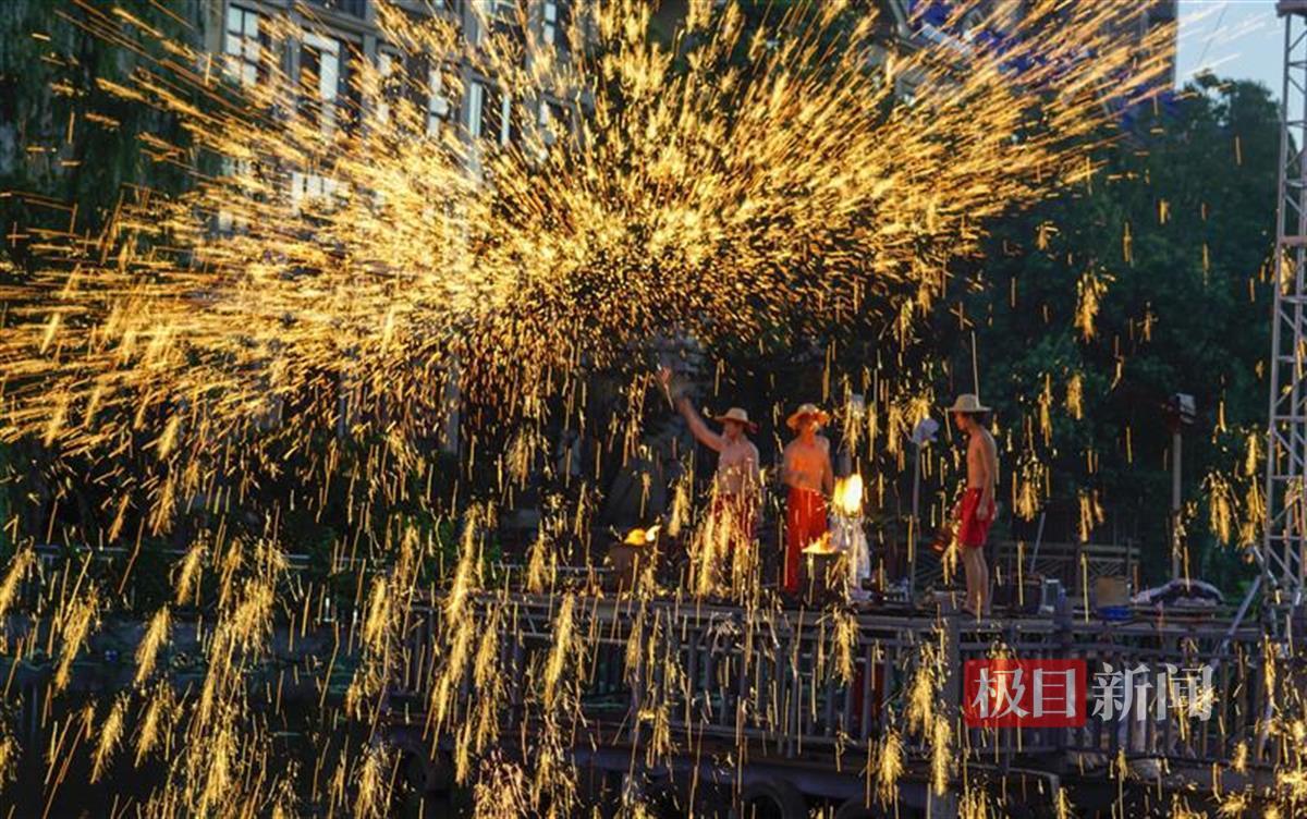 极目新闻记者在园区看到,数千盏山海花灯交相辉映,将公园装点得如梦似幻。在“鲸奇迎宾秀”中,超过3米高的大型动物杖头人偶震撼登场,与游客们进行亲密互动,让孩子们兴奋不已,而在欢乐秀场,一场关于成长的童话剧“魔法匹诺曹”正在上演,小朋友们聚精会神地观看着,沉浸在童话世界的奇妙与美好之中。此外,“铁树银花”表演更是将现场变成了一场奇幻浪漫的光影之旅,打铁花、焰火长廊、烟花瀑布等多种元素交织在一起,让人仿佛置身于一个梦幻般的世界。