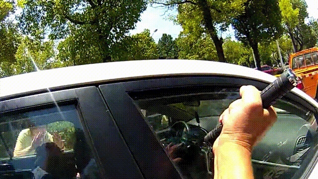 在车内配备锤子等物品,让孩子知晓必要时可直接击碎车窗玻璃自救。注意!要用锤子敲击侧面窗户的四个边角,才容易砸开。