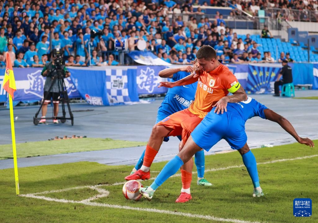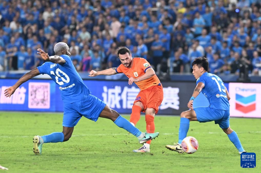 7月21日,山东泰山队球员克雷桑(中)在比赛中拼抢。新华社发(邱宇摄)