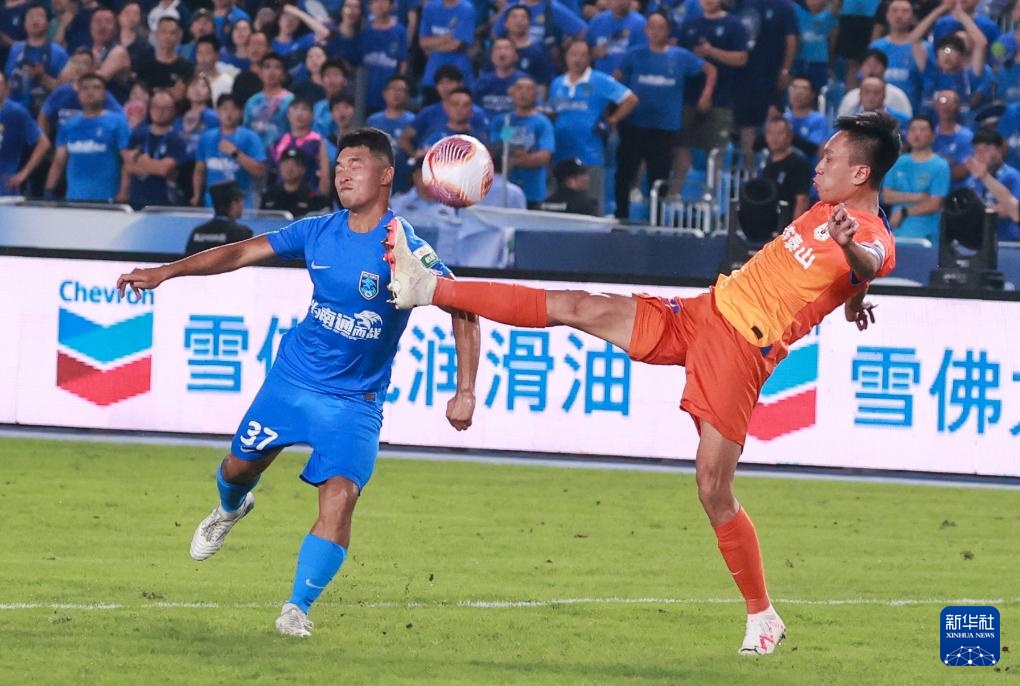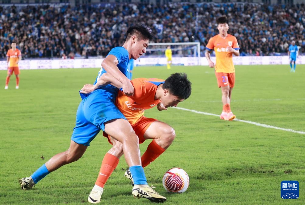 7月21日,南通支云队球员叶道驰(下)与山东泰山队球员谢文能在比赛中拼抢。新华社发(王须中摄)