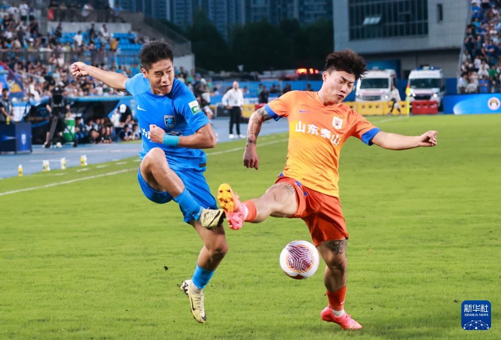 7月21日,山东泰山队球员谢文能(右)与南通支云队球员叶道驰在比赛中拼抢。新华社发(邱宇摄)