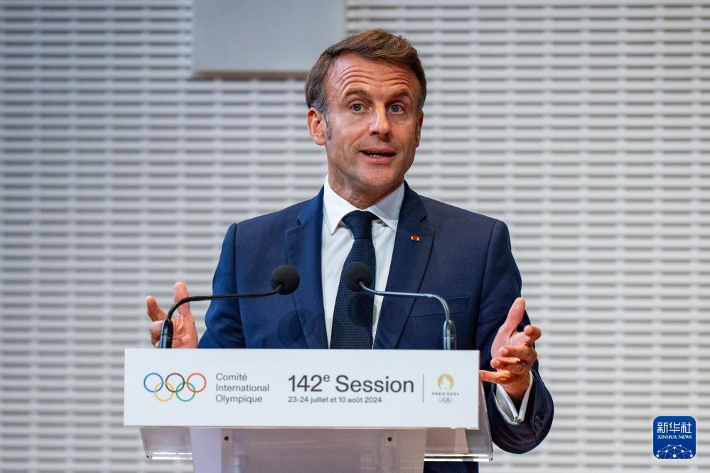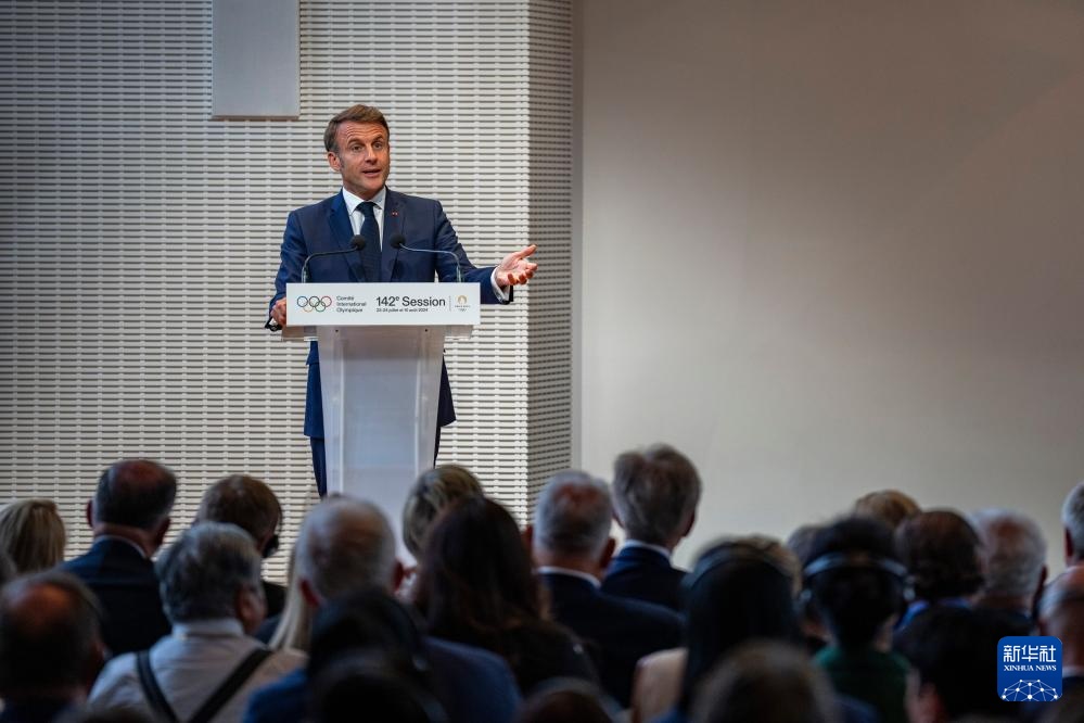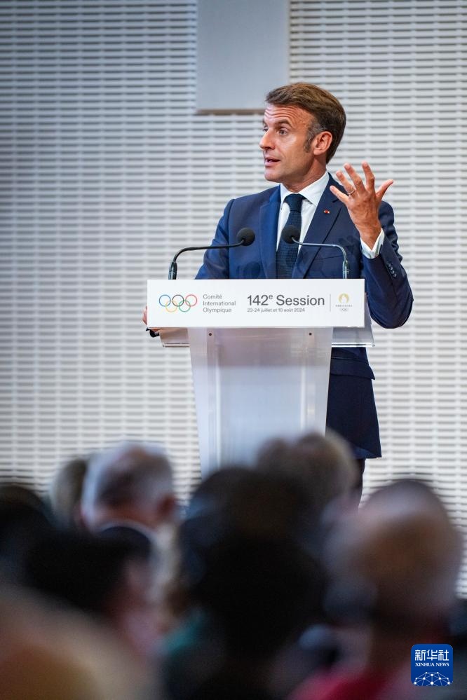 7月22日,法国总统马克龙在开幕式上发言。新华社记者 孙非 摄