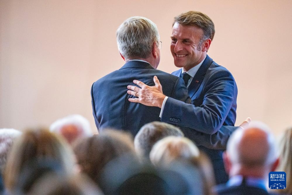 7月22日,法国总统马克龙(右)和国际奥委会主席巴赫在开幕式上拥抱。新华社记者 孙非 摄