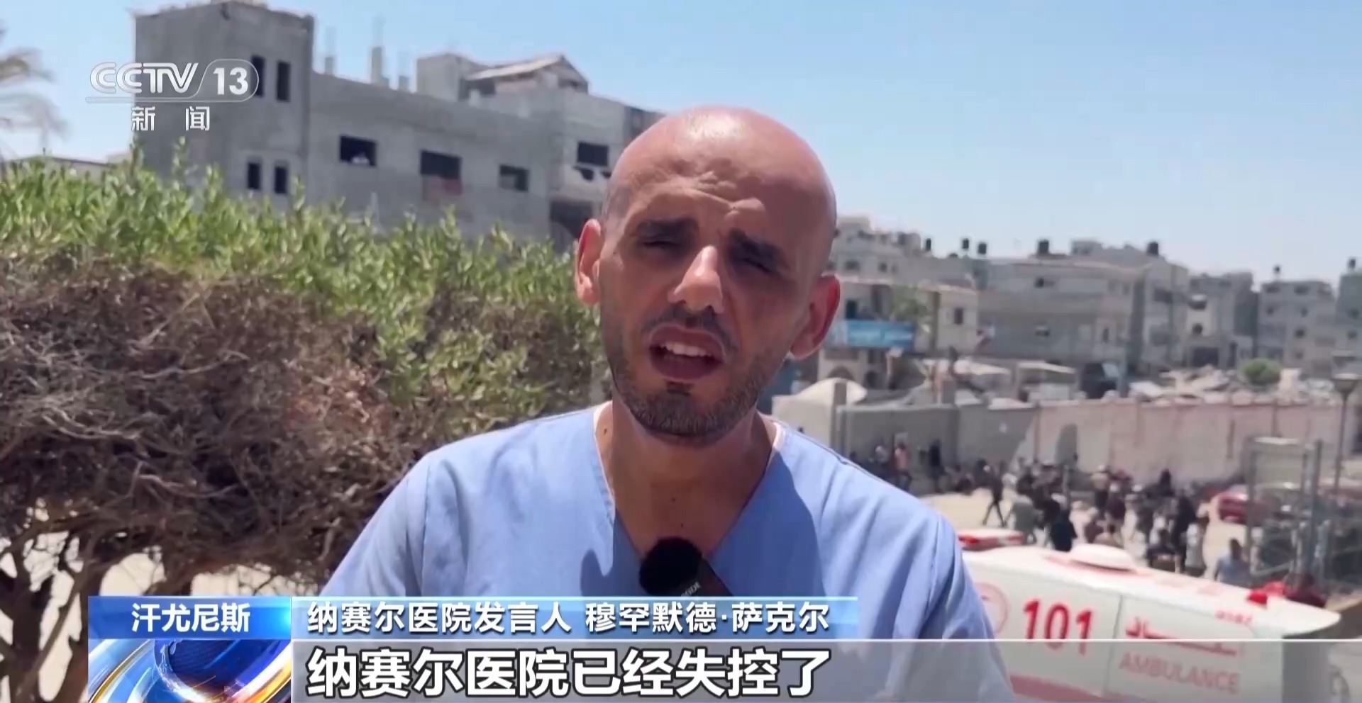 纳赛尔医院发言人 穆罕默德·萨克尔:纳赛尔医院已经失控了,我们的接诊情况已经失控,三个小时内,我们已经接收了数百名死伤者,医院的情况非常糟糕,我们需要医疗用品。数十名伤者现在只能躺在地上,我们找不到床位安置伤患,我们找不到足够的医疗用品去医治他们,我们简直像在血泊中游泳。