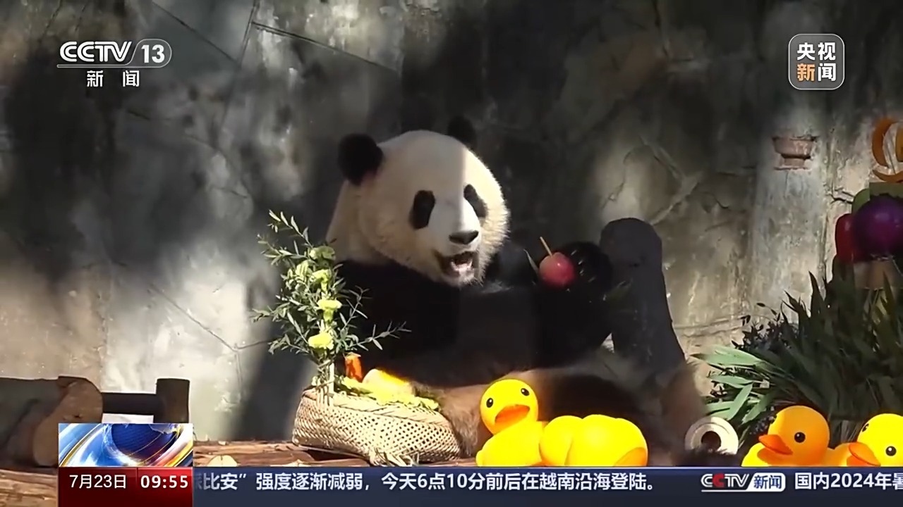 在重庆动物园熊猫馆,龙凤胎大熊猫“渝可”“渝爱”一出场就吸引了游客的关注。饲养员用竹笋、西瓜、胡萝卜等食材制作了专属蛋糕,还摆放着木马、小黄鸭等玩具,兄妹俩一边吃、一边玩,享受着生日的快乐。