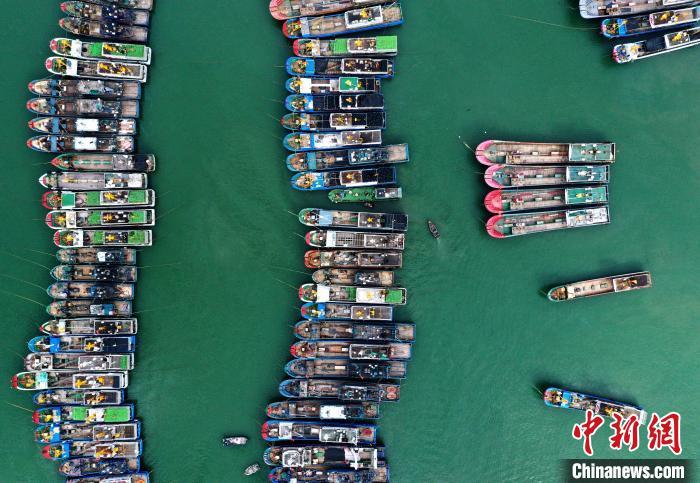 7月23日,渔船在福州市连江县黄岐国家中心渔港内避风。今年第3号台风“格美”体积庞大、强度强,将正面袭击福建,带来严重风雨影响。据福建省气象台预计,“格美”将以每小时20公里左右的速度向偏北转西北方向移动,强度逐渐增强,最强可达强台风级或超强台风级,24日夜间在台湾省中北部沿海登陆,之后穿过台湾省,将于25日下午到傍晚在福建中北部沿海登陆。根据福建省防汛办的部署安排,24日9时前,福建全省沿海养殖渔排的老弱妇幼人员务必全部撤离上岸;24日12时前,位于闽东、闽中、闽南、闽外渔场和钓鱼岛海域作业的渔船务必全部就近到港避风、船上人员撤离上岸,泉州及以北沿海养殖渔排的劳动力人员务必全部撤离上岸。(无人机照片)中新社记者 张斌 摄