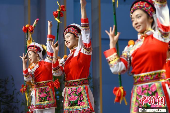 7月23日,非遗展演白族霸王鞭。当日,为期6天的第8届中国—南亚博览会在云南省昆明市开幕。文化旅游体育馆内各参展商带来异彩纷呈的非遗舞蹈、非遗技艺展示吸引观众前来参观、体验。中新社记者 李嘉娴 摄