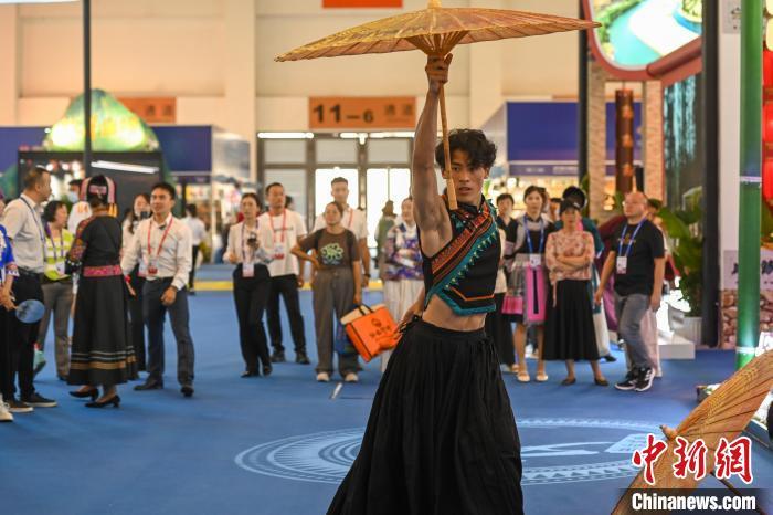 7月23日,云南文山展台舞蹈表演吸引观众观看。当日,为期6天的第8届中国—南亚博览会在云南省昆明市开幕。文化旅游体育馆内各参展商带来异彩纷呈的非遗舞蹈、非遗技艺展示吸引观众前来参观、体验。中新社记者 李嘉娴 摄