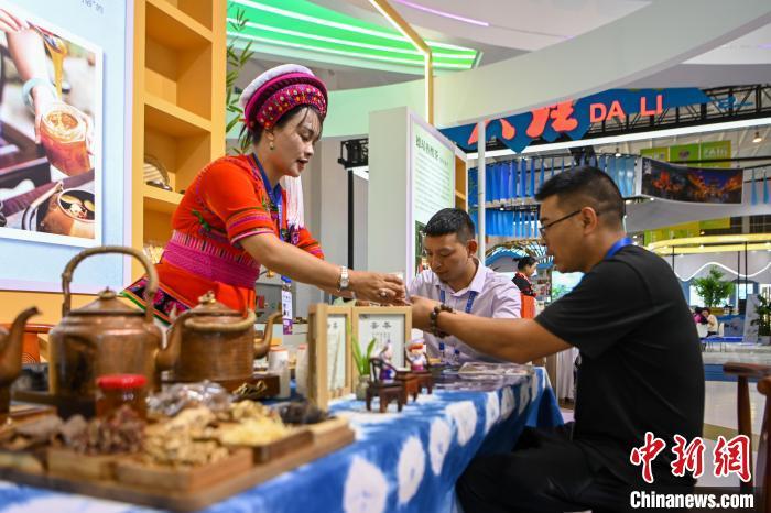 7月23日,观众体验国家级非遗白族三道茶。当日,为期6天的第8届中国—南亚博览会在云南省昆明市开幕。文化旅游体育馆内各参展商带来异彩纷呈的非遗舞蹈、非遗技艺展示吸引观众前来参观、体验。中新社记者 李嘉娴 摄