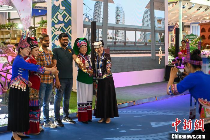 7月23日,外国参展商与云南文山壮族、彝族演员合影。当日,为期6天的第8届中国—南亚博览会在云南省昆明市开幕。文化旅游体育馆内各参展商带来异彩纷呈的非遗舞蹈、非遗技艺展示吸引观众前来参观、体验。中新社记者 李嘉娴 摄