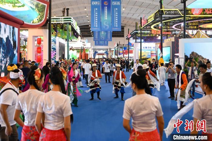 7月23日,云南迪庆藏族自治州演员在展厅内跳起国家级非遗锅庄舞。当日,为期6天的第8届中国—南亚博览会在云南省昆明市开幕。文化旅游体育馆内各参展商带来异彩纷呈的非遗舞蹈、非遗技艺展示吸引观众前来参观、体验。中新社记者 李嘉娴 摄