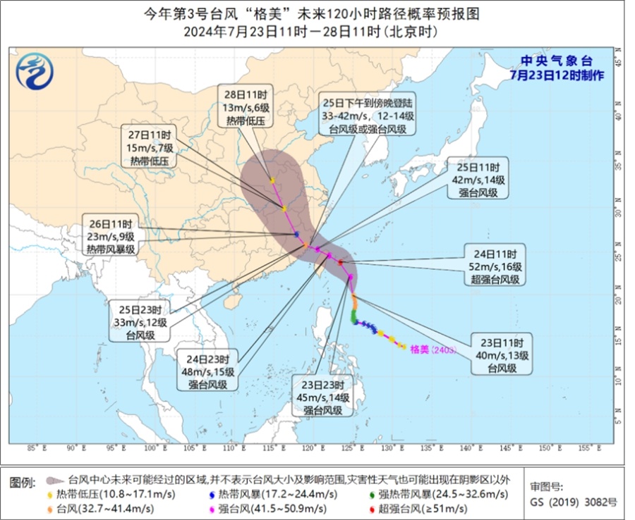 人民网福州7月23日电 (杨灏昱)据福建省气象局消息,今年第 3 号台风“格美”体积庞大、强度强,将正面袭击福建,带来严重风雨影响。23日11时,福建省气象台将“台风预警”提升至Ⅲ级。