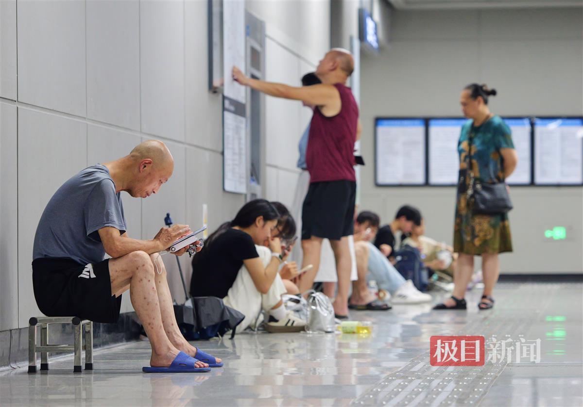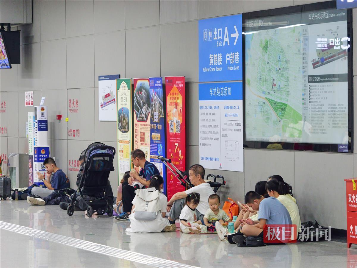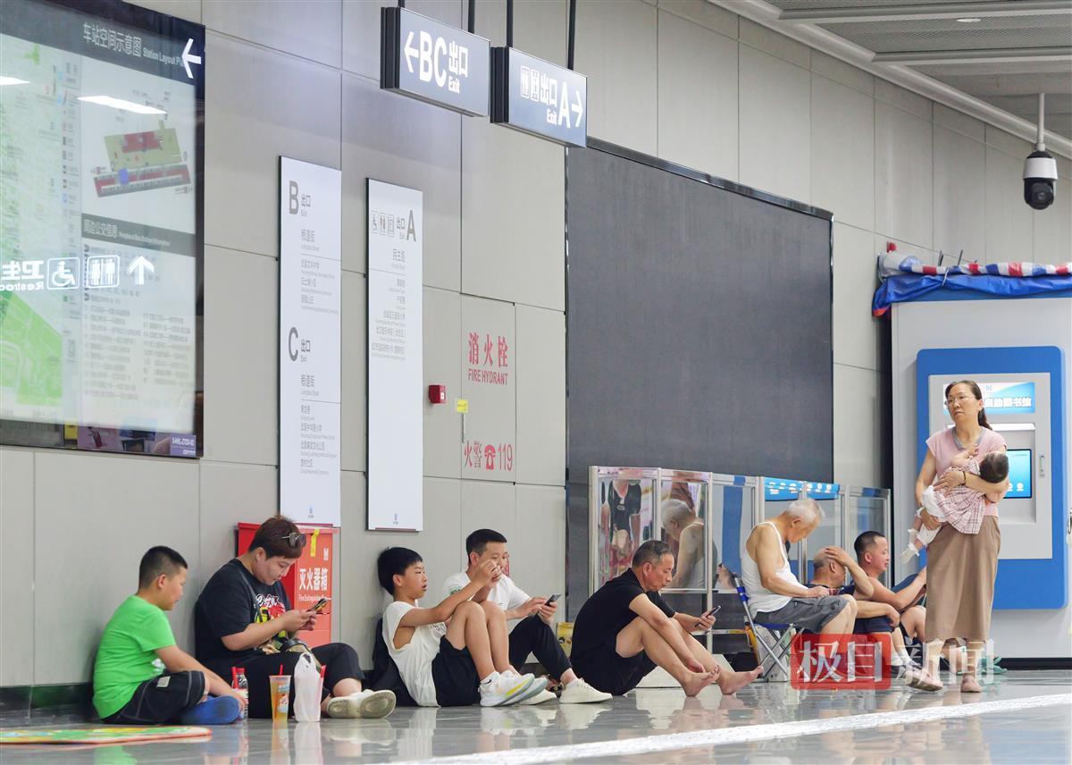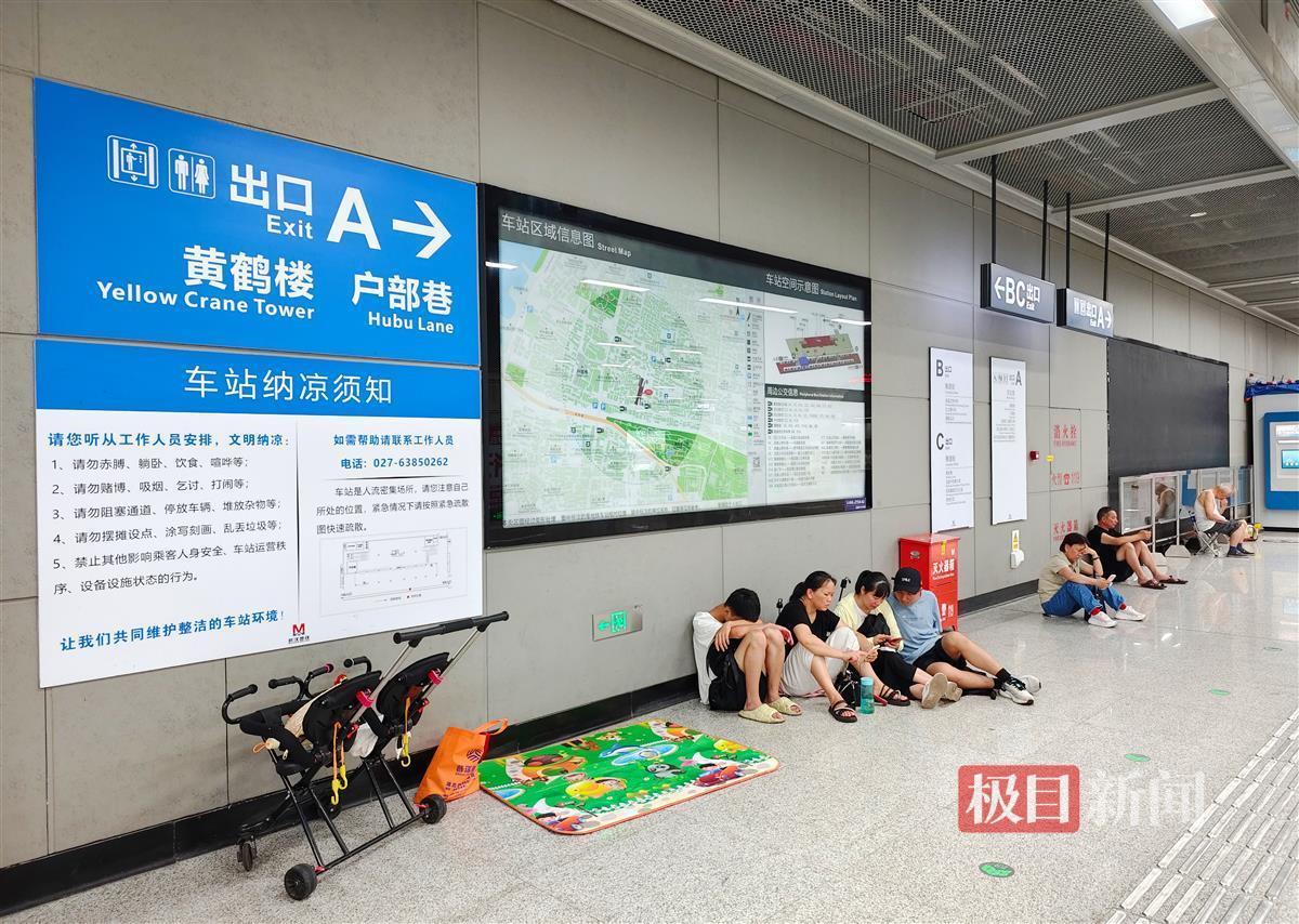 7月24日中午,极目新闻记者来到地铁5号线司门口黄鹤楼站。记者看到,车站划出了乘客通行较少的区域作为纳凉专区,墙上张贴了醒目的纳凉须知,数十名市民乘客在此乘凉休息。