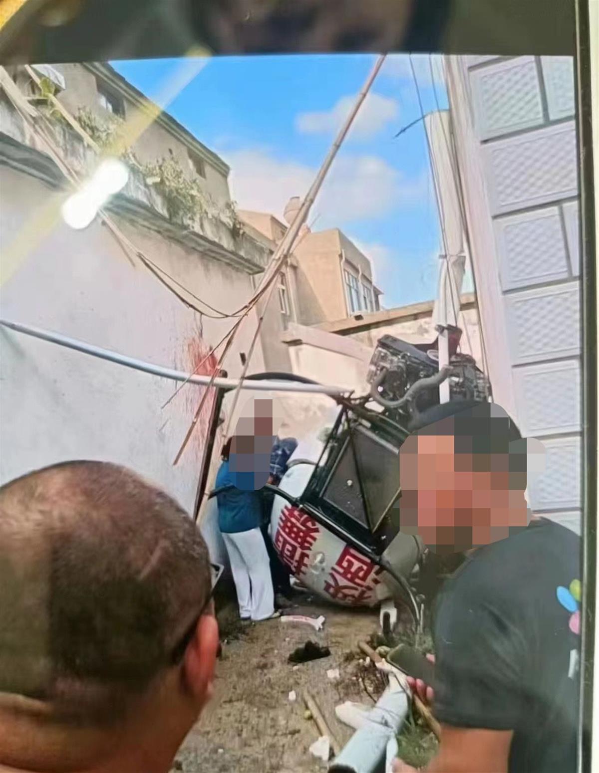 事发现场的照片显示,一架飞行器卡在两间民房之间。