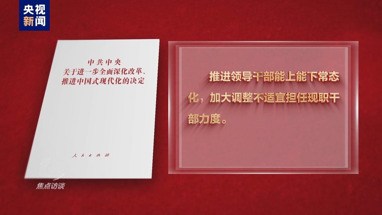 中央组织部研究室(政策法规局)主任(局长) 张强:干部能上不能下,是长期困扰我们的一个老大难问题。党的十八大以来,党中央制定实施《推进领导干部能上能下规定》,在解决这个问题上取得了突破性进展。《决定》进一步强调,要推进领导干部能上能下常态化,加大调整不适宜担任现职干部力度,推动形成能者上、优者奖、庸者下、劣者汰的良好局面。