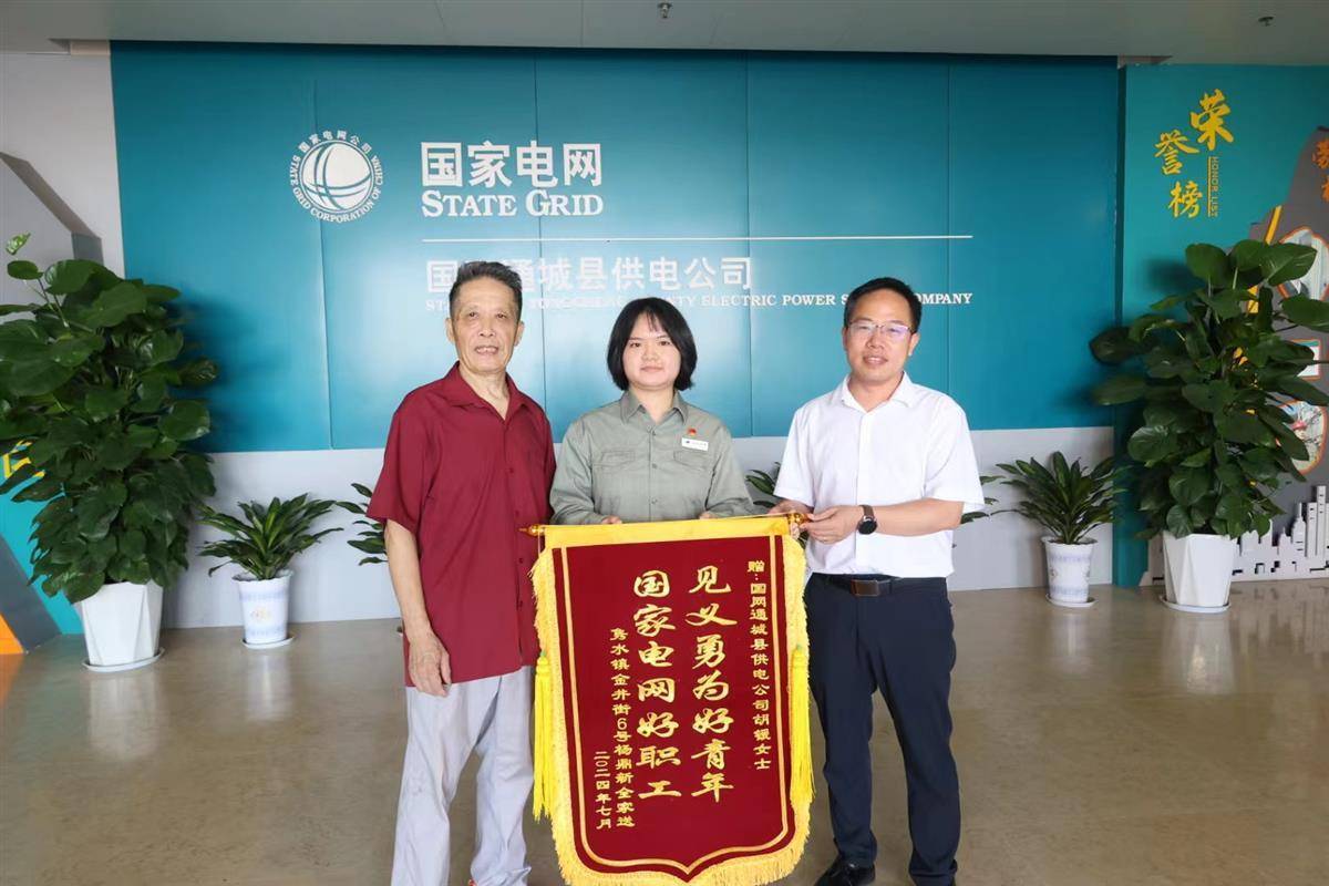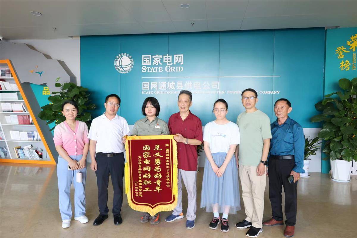 湖北日报讯(记者汪洋、通讯员李索、杨微微)7月24日上午,咸宁通城县杨鼎新老人携全家共7口人,专程来到国网通城县供电公司,将一面印有“见义勇为好青年、国家电网好职工”字样的锦旗送到该公司职工胡锾手中,感谢她在7月1日雨夜及时救助。