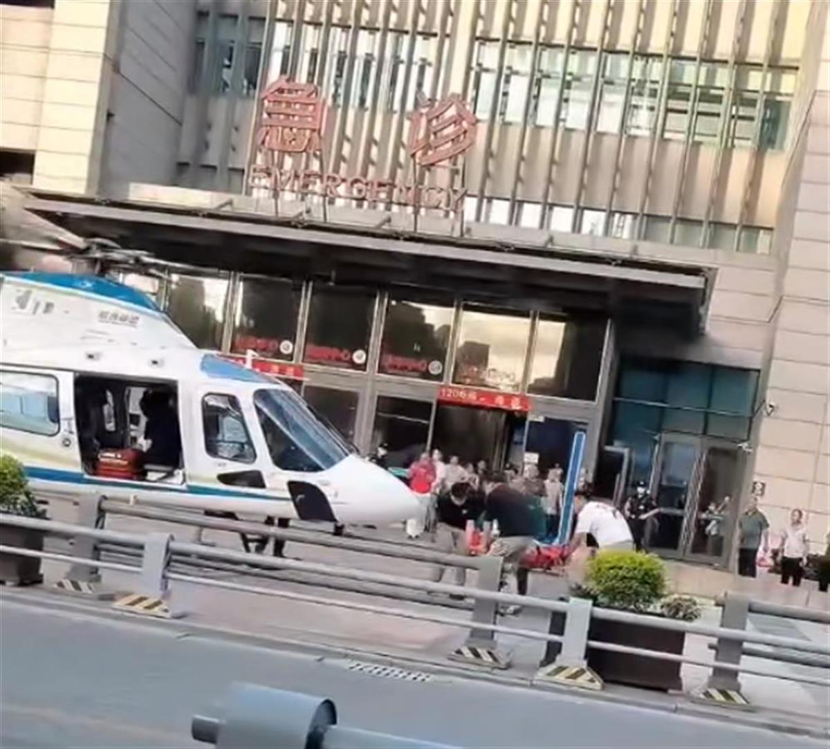 多段网传视频显示,一架编号为B-70NY的直升机降落在嘉兴市第一医院急诊科门口,有工作人员用担架从医院急诊室抬出病人,迅速登上了直升机。随后直升机在原地起飞,附近有多名围观群众,身着黑色衣服的保安在维持秩序,阻止人员靠近。
