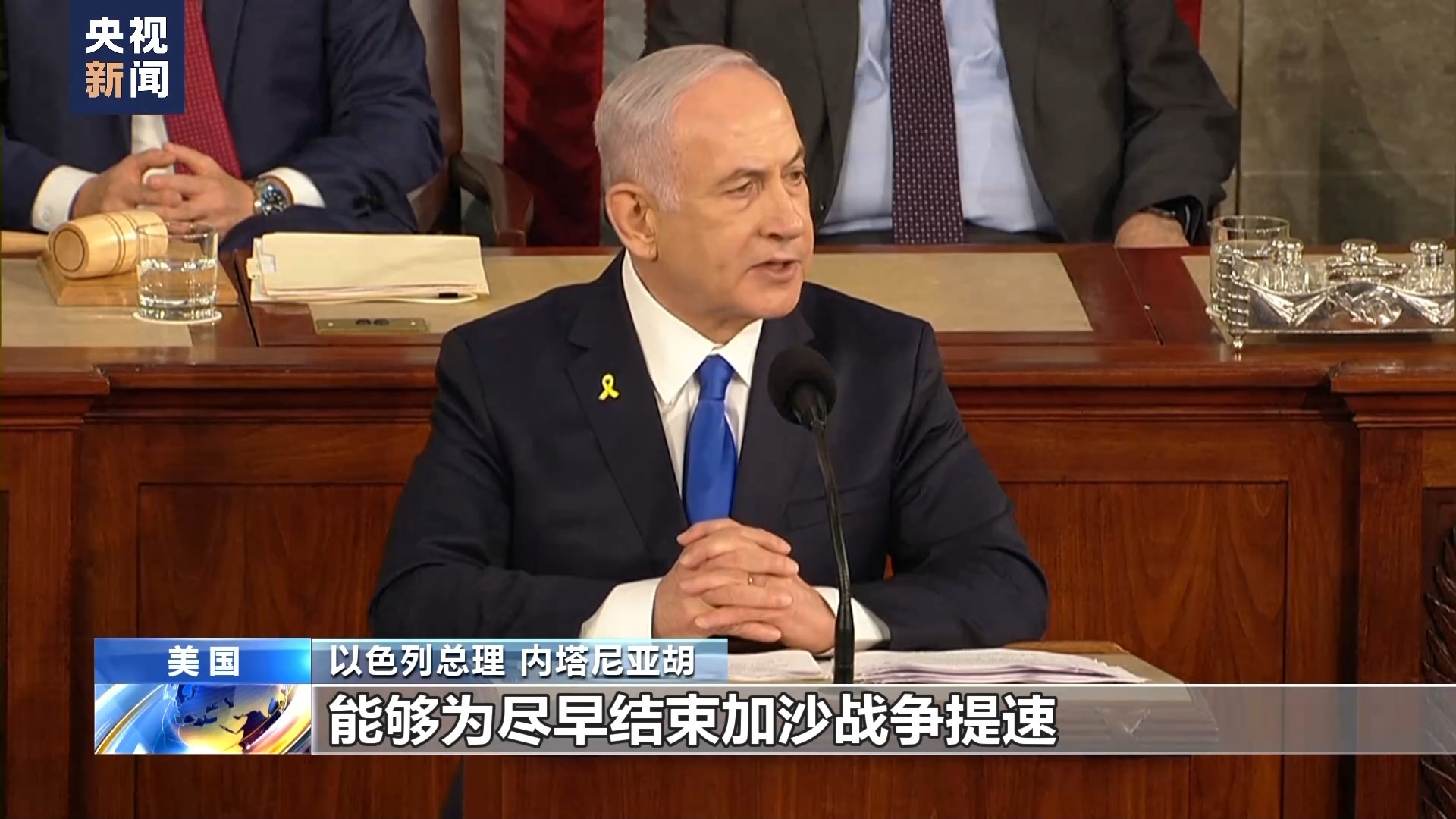内塔尼亚胡在美国国会发表讲话时表示,以色列将继续在加沙地带的军事行动,直到摧毁巴勒斯坦伊斯兰抵抗运动(哈马斯)的军事力量,并促使以色列被扣押人员获释。他还呼吁美国继续向以色列提供武器。