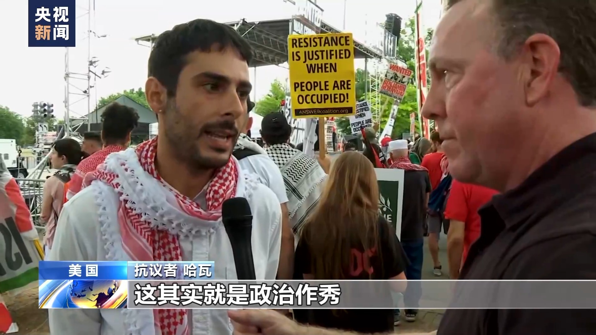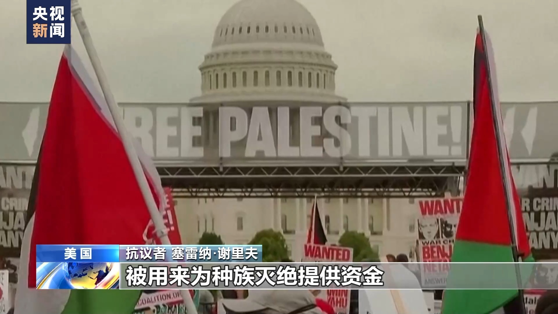 抗议者 米丽娅姆·奥斯曼:美国到现在已经花了几十亿美元向以色列运送武器,来谋杀巴勒斯坦人。美国不仅是种族灭绝的同谋,实际上是美国使得这场种族灭绝成为可能。