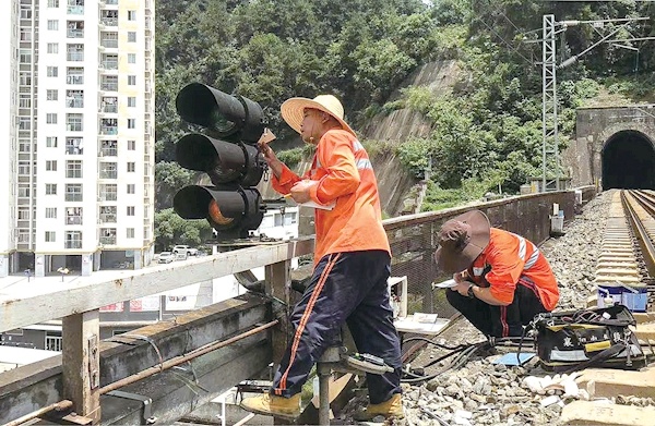 下午1时,襄阳电务段十堰电务车间十堰信号工区的工人踏上襄渝铁路线,开始巡检线路设备。他们的目光专注,不放过任何一个可能影响行车安全的细节。烈日炙烤下,钢轨表面温度逼近60℃,他们的脸上已是密密麻麻的汗珠。