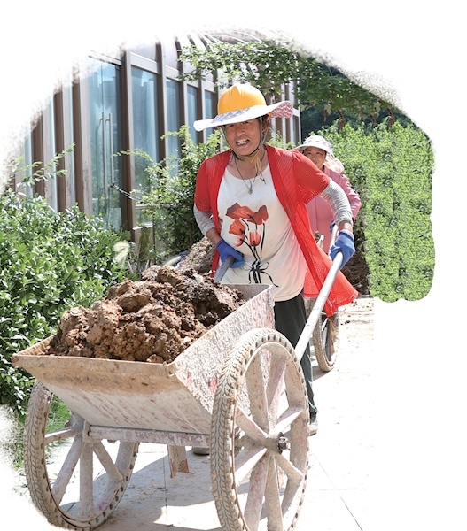下午3时,室外温度达38℃,国瑞里社区一处建筑工地,几名建筑女工头顶烈日,运送建筑材料。她们的皮肤被晒得黝黑发亮,却依然干劲十足。
