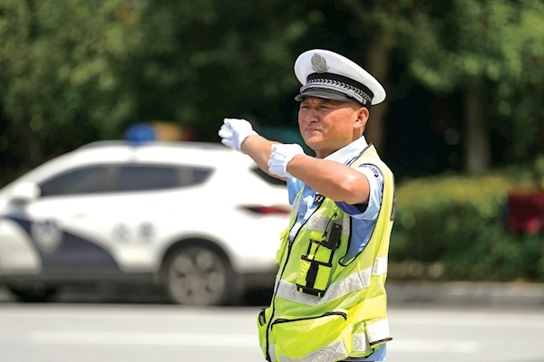 中午烈日当头,交警五大队的民警站在繁忙的路口,指挥来来往往的车辆和行人。他们的脸庞被晒得通红,警服被汗湿透了。
