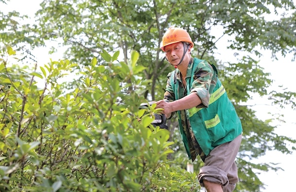 上午9时,十堰大道旁的绿化带上,市园林绿化管理局园林绿化养护工人精心修剪绿篱和花池石楠柱造型。电锯发出阵阵轰鸣,伴随着多余枝叶的落下,工人脸上的汗珠也在滚动。他们攀高爬低,留下一道道整齐的优美线条。