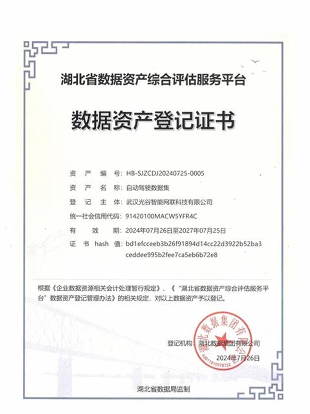 7月26日,极目新闻记者获悉,光谷交通全资子公司武汉光谷智能网联科技有限公司成功完成自动驾驶数据资源入表工作,获批湖北省内首张自动驾驶领域数据资产登记证书,实现了东湖高新区数据资产化零的突破,成为湖北省首个自动驾驶领域数据资产入表登记案例。