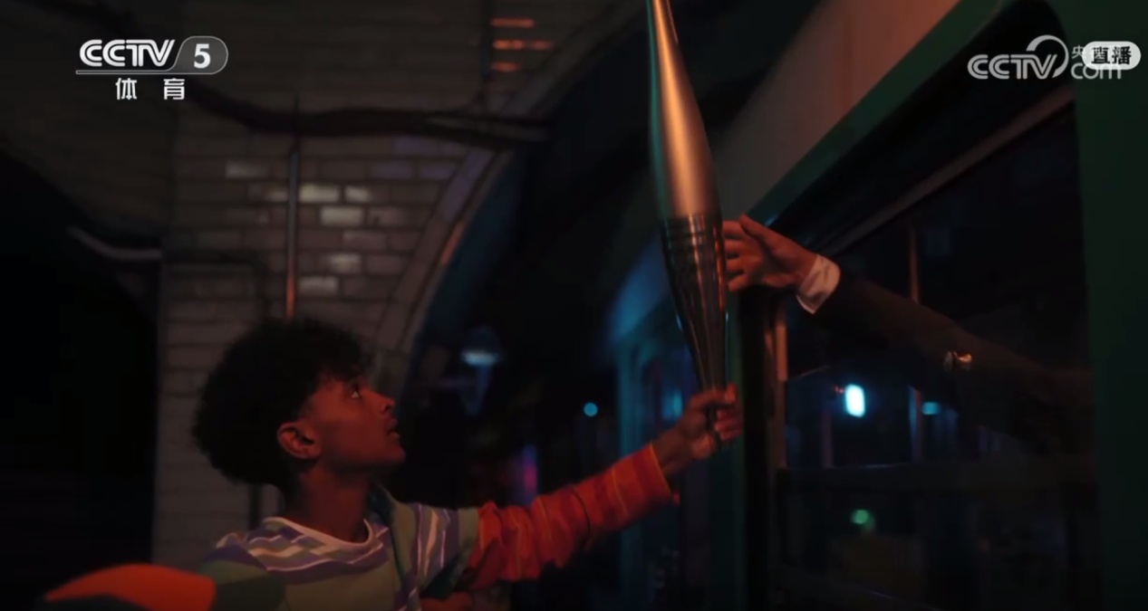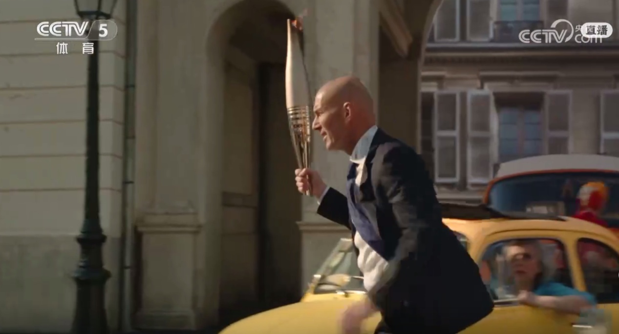 法国球星齐达内带着火炬穿过巴黎的大街小巷,随后三个法国少年将圣火带到塞纳河畔交给神秘火炬手。