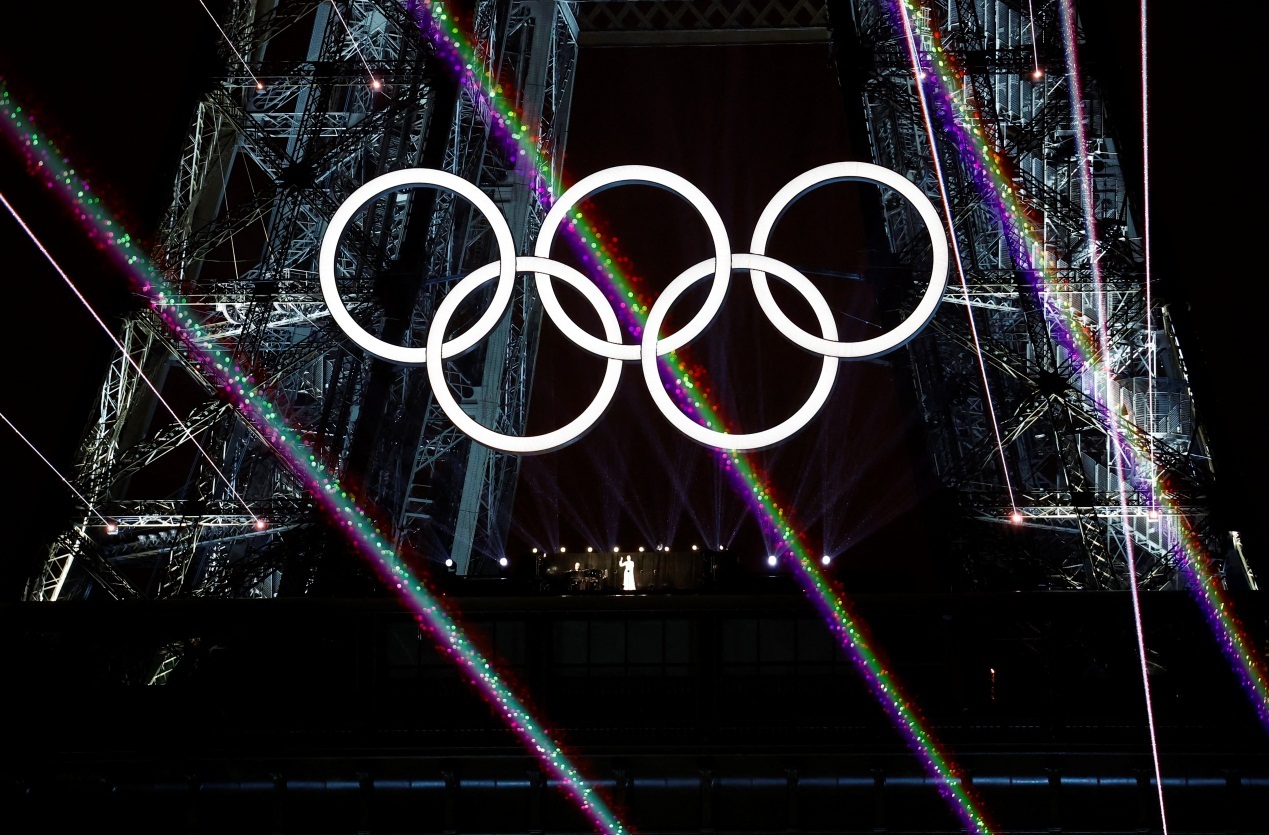 开幕式上,巴黎奥运五环与埃菲尔铁塔交相辉映。