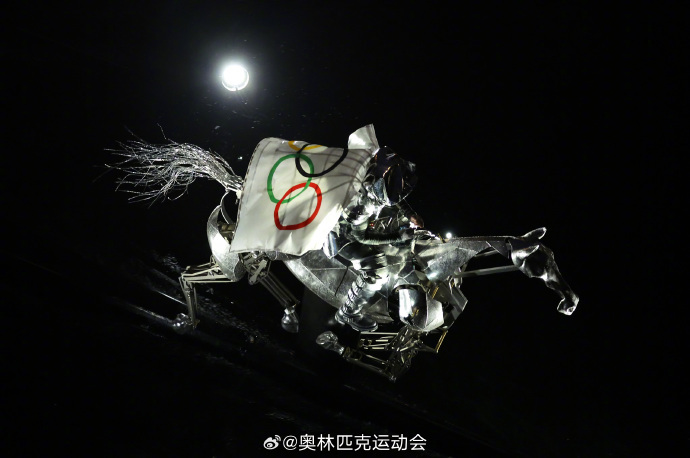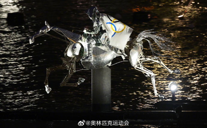 一名女骑手骑着马奔驰在塞纳河上。女骑手身披着奥林匹克五环旗,如同象征着奥林匹克精神的使者,疾驰而来。